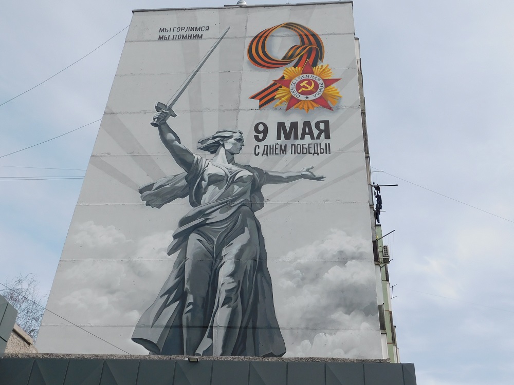Патриотическую картину – символику нынешнего Года Защитника Отечества – Родину-мать — размером в девятиэтажный дом изобразили художники и промышленные альпинисты на днях на стене девятиэтажного дома, торцом расположенного к въезду в поселок.