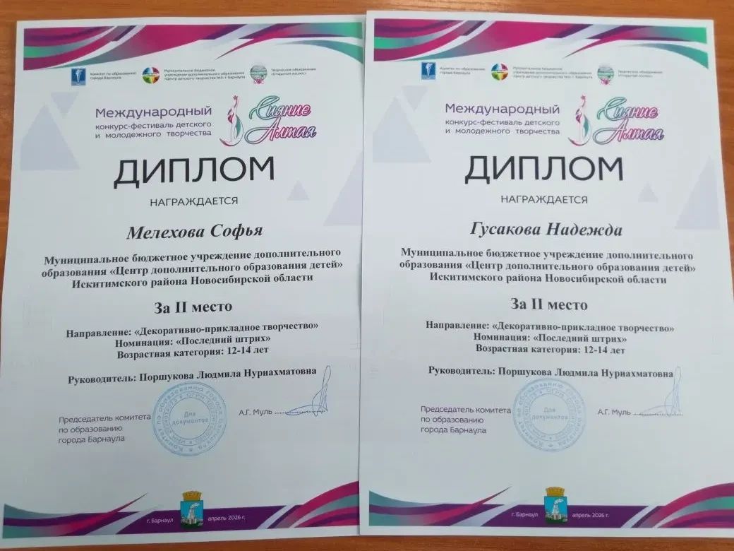 Учащиеся творческого объединения «Радужка» под руководством Оксаны Гукиной продемонстрировали высший класс на Международном конкурсе-фестивале детского и молодежного творчества «Сияние Алтая»: Менская Надежда и Менская Вера покорили жюри своими работами в области декоративно-прикладного искусства, завоевав заслуженное 1 место.